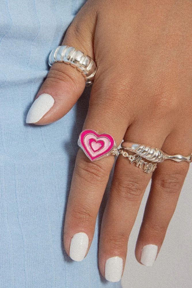 Sim, ele foi inspirado naquele desenho dos anos 2000 com meninas super poderosas hahaha! São muitos detalhes que fazem ele ser considerado o anel mais icônico da C e Ci. Primeiro vamos para o detalhe do coração colorido, ele é pintado a mão um por um com resina. Intercalamos 2 tons de rosa que gerou um efeito incrível. Mas o maior diferencial desse anel está no seu aro, nele possui detalhes em microzircônias que formam desenhos de estrelas e raio, simbolizando poder, explosão brilho, literalmente é um coração radiante! O seu tamanho robusto faz ele ser a estrela principal de qualquer mix de anel, com ele é certeza de que você irá receber vários elogios