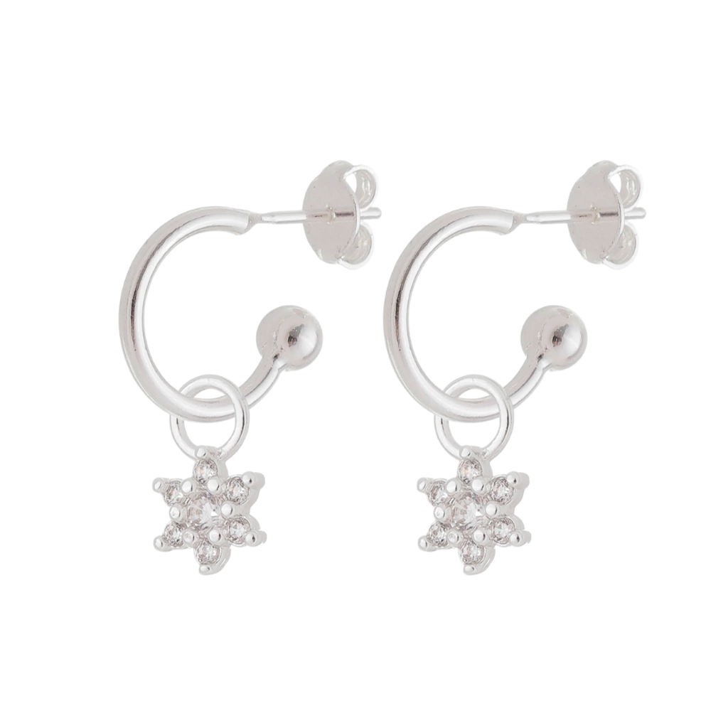 Dados técnicos: Argolinha com 1cm de diâmetro e acompanha par de pingentes flor com zircônias que possui 0,7cm. Peça toda banhada a Prata.